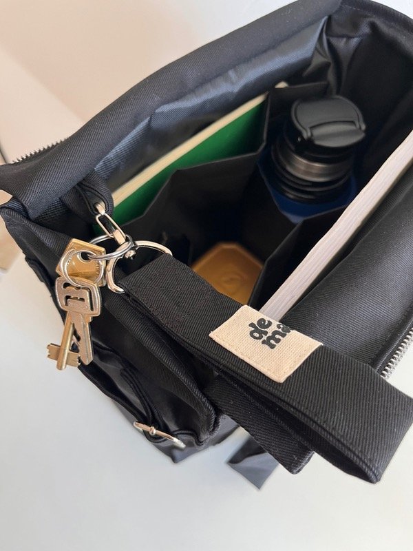 Su interior es impermeable 💦 tiene dos bolsillos grandes internos donde entran hasta 2 cuadernos A4. Dos porta botella / termo y porta mate. Y un llavero combinando con el bolso para siempre tener tus llaves a mano 🔑