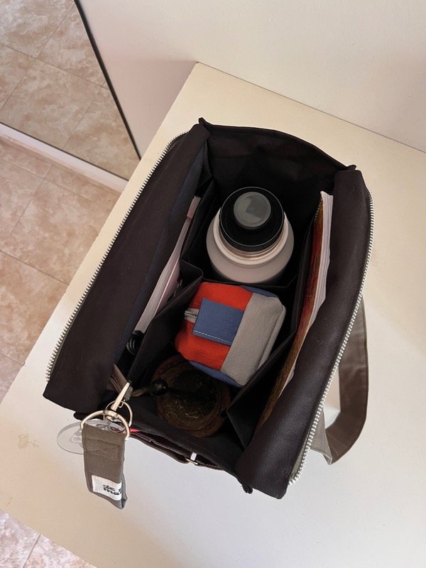 Su interior es impermeable 💦 tiene dos bolsillos grandes internos donde entran hasta 2 cuadernos A4. Dos porta botella / termo y porta mate. Y un llavero combinando con el bolso para siempre tener tus llaves a mano 🔑